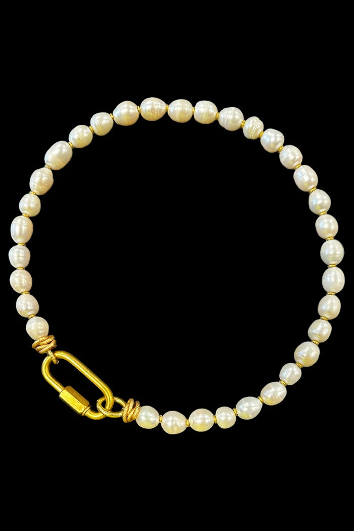 Large brass industrial claps and large fresh water pearls. pears are said to enhance integrity and kindness. They are the "store of inner wisdom" carrying the lucid moment of water within them inviting you to find your own balance and flow.