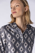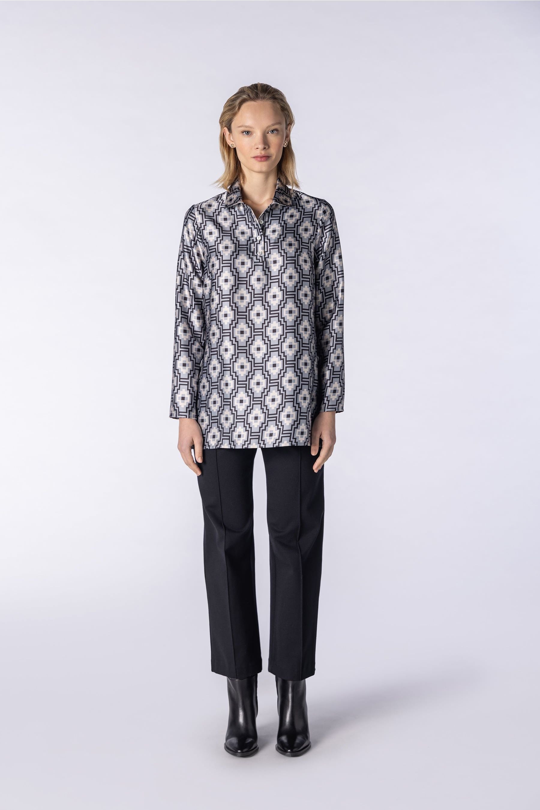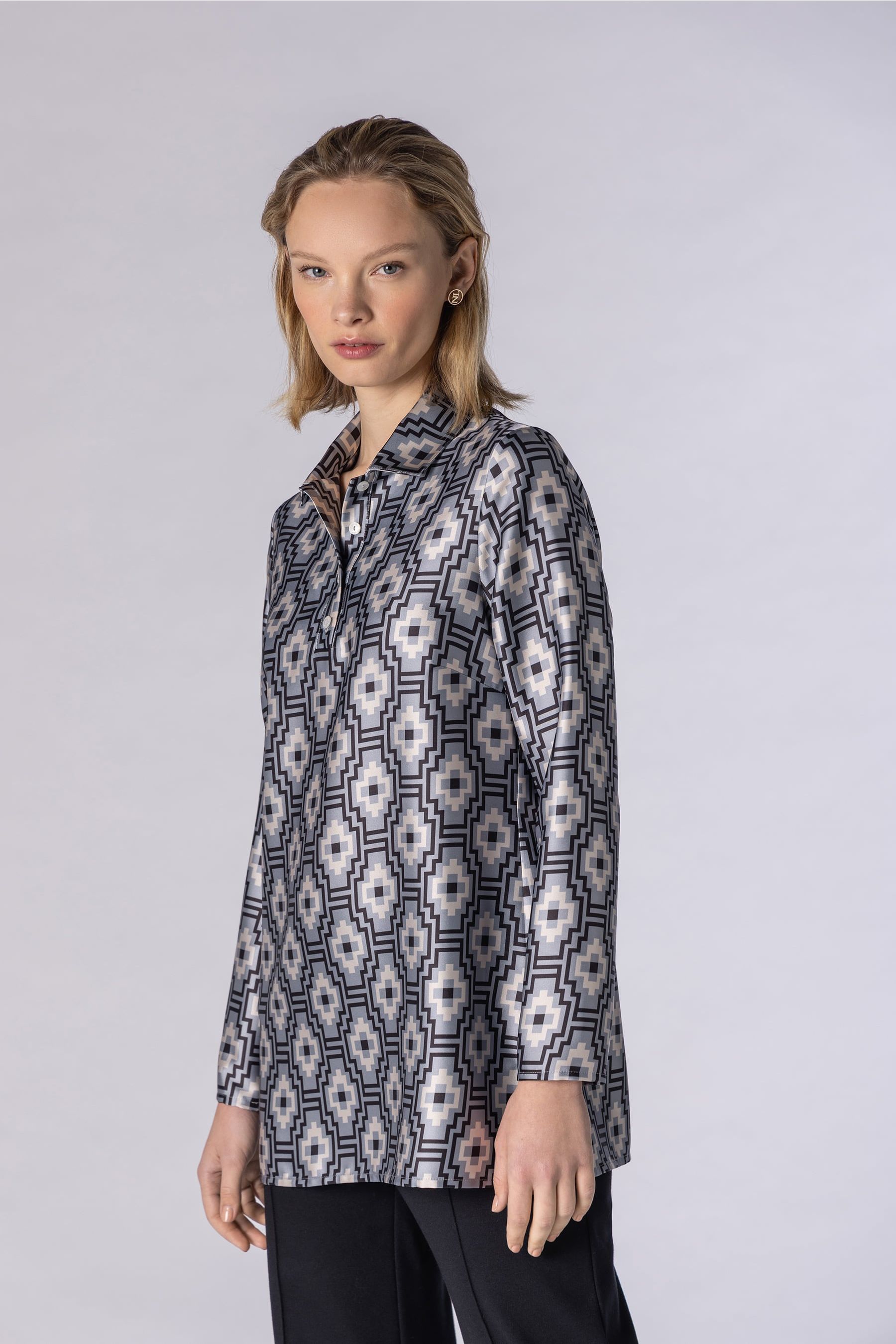 This blouse has been made from printed satin patterned with an elegant geometric print. It has an open collar and long sleeves.
