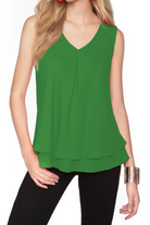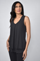 Sleeveless double layered camisole with front box pleat. This is a great layering piece offered in multiple colors.