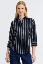 Classic with a twist, Margie brings modern edge to an everyday essential. Bold, vertical stripes give this timeless button-up a confident look, while a peek of houndstooth under the collar and cuffs adds unexpected personality. The three-quarter sleeves keep things casual, and the easy silhouette makes it endlessly versatile — from office-ready to weekend relaxed.