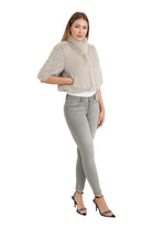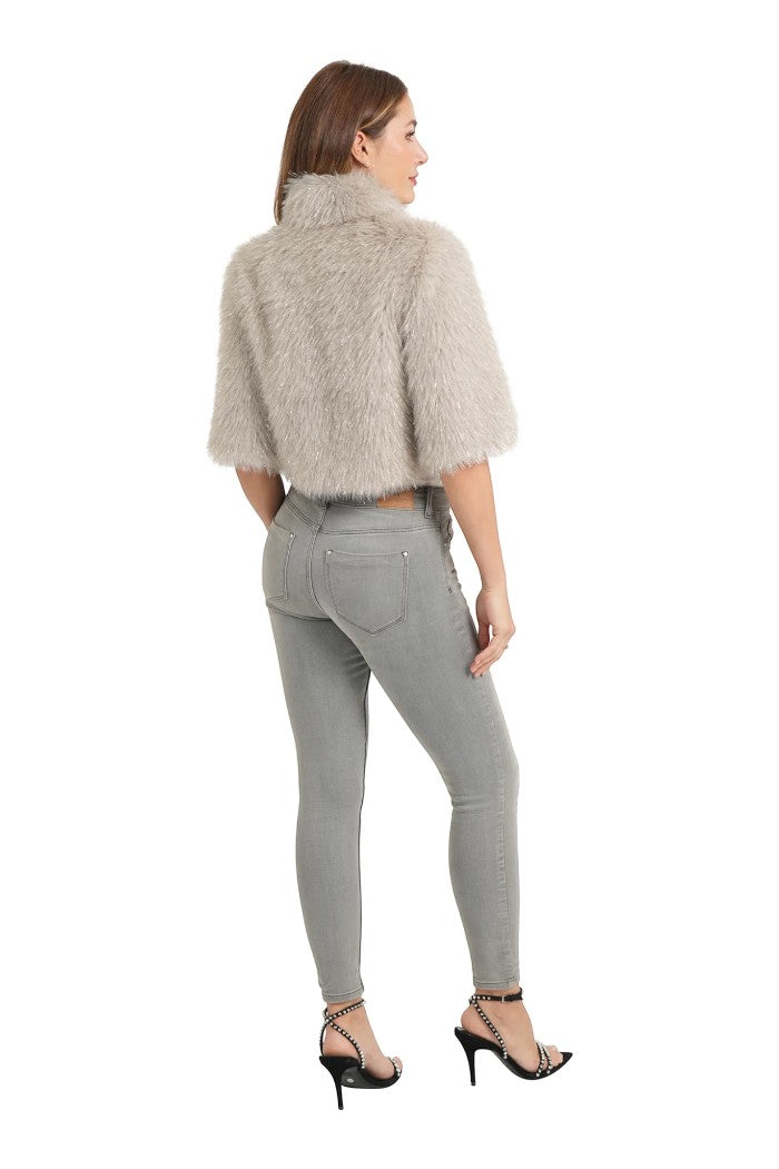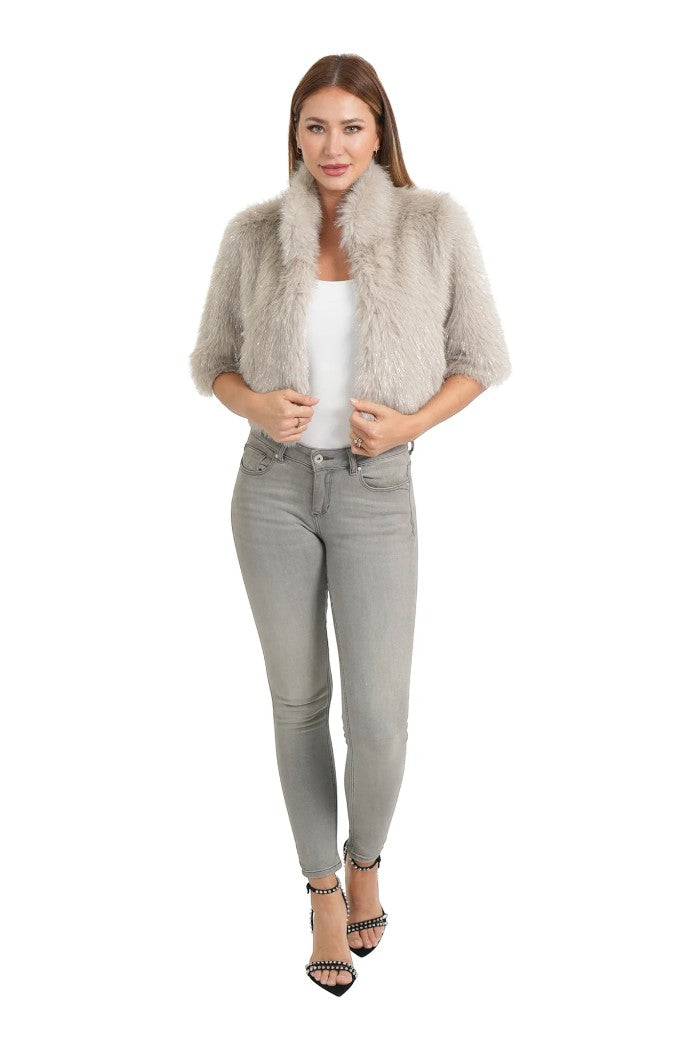 Alice metallic faux fur cropped shrug, stand color, interior lining, hook & eye closure, elbow length sleeves, cropped style.