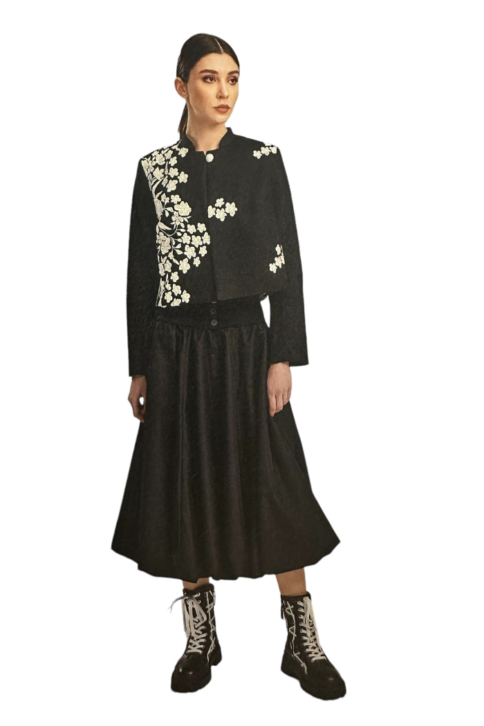 The lace detailing on our jacket adds a touch of femininity and texture, creating a beautiful contrast with the edgy cropped silhouette. It's a perfect balance between classic charm and contemporary fashion.