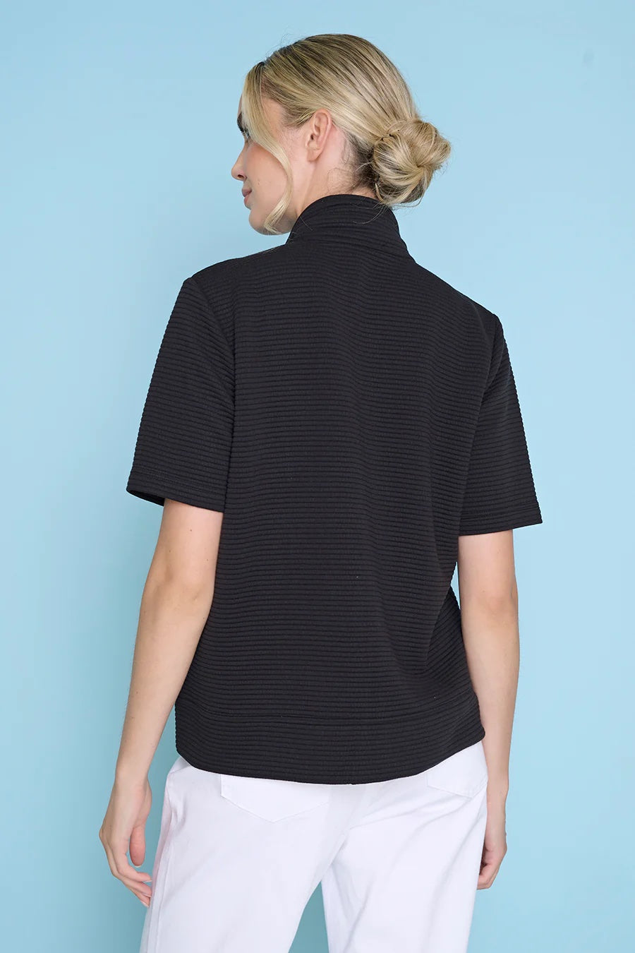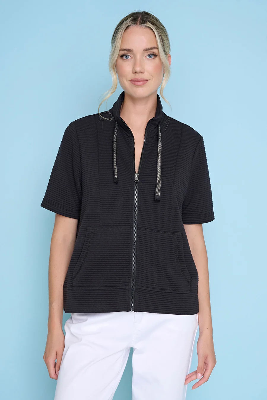 A lightweight zip-front jacket with a short, boxy silhouette and ribbed texture. The Zip-Front Jacket features a full front zipper, short sleeves and front pockets for easy wear. Picadilly designed this piece to feel sporty-casual while layering comfortably over tees or lightweight tops.