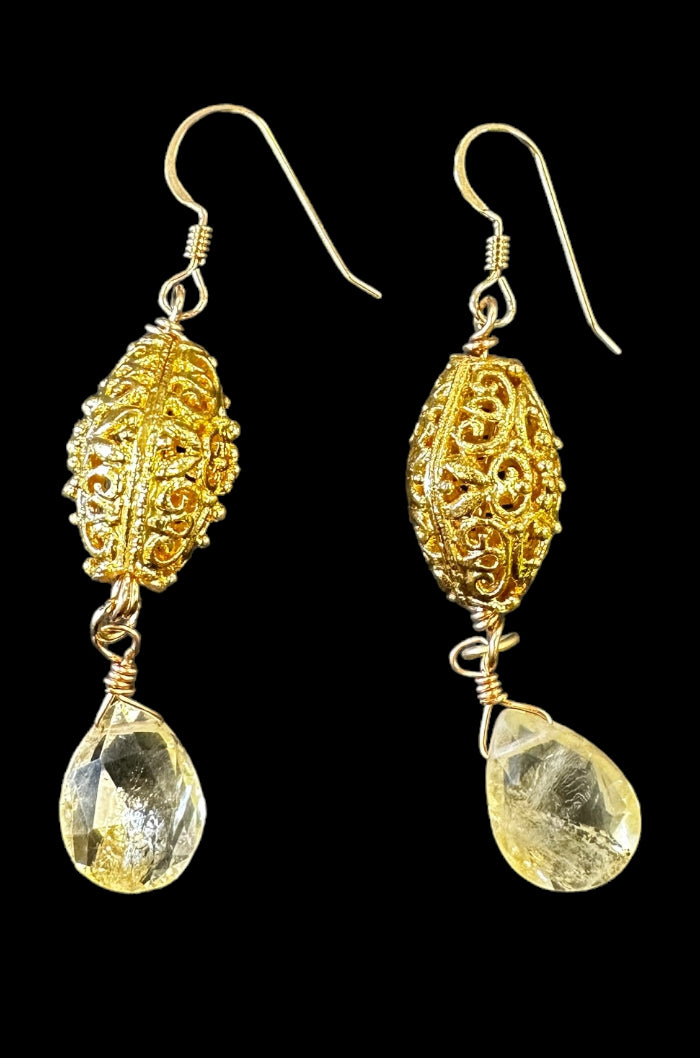 hese delicate earrings fall perfectly around the face highlighting one's beauty. Honoring ISIS, the Etruscan Goddess of magic, motherhood, healing, and rebirth. Citrine encourages creativity, positivity, and abundance. Wearing citrine enhances one's manifesting powers and brings positivity into one's life.