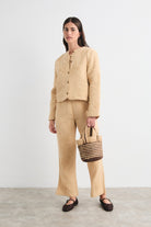 A relaxed, button-front jacket with a softly quilted texture and a cropped, boxy silhouette. The Altan Jacket pairs easygoing structure with subtle stitched details for everyday layering. Mus & Bombon designed this piece in a lightweight, textured fabric that suits transitional weather. Wear it over tees for a refined casual look.