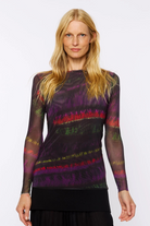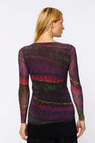 The Taos Top is a sheer, long-sleeve printed top with a high neckline and vivid painterly stripes. AMB Designs created this lightweight mesh piece to layer under jackets or wear solo for an artful evening look. The slim silhouette and translucent fabric give it a modern, night-out-ready edge while still feeling casual enough for creative everyday wear.