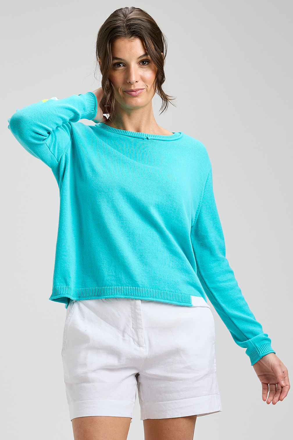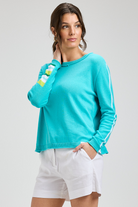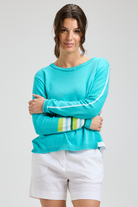 A relaxed, lightweight sweater in a bright aqua hue with subtle stripe details on the sleeves. The Aqua Sweater has a classic crew neckline and a boxy, slightly cropped silhouette that layers easily over shorts or jeans. Knit construction gives it a soft, casual feel perfect for weekend wear or warm-weather evenings. This cozy style from Zaket & Plover balances easy comfort with a fresh, summery look.