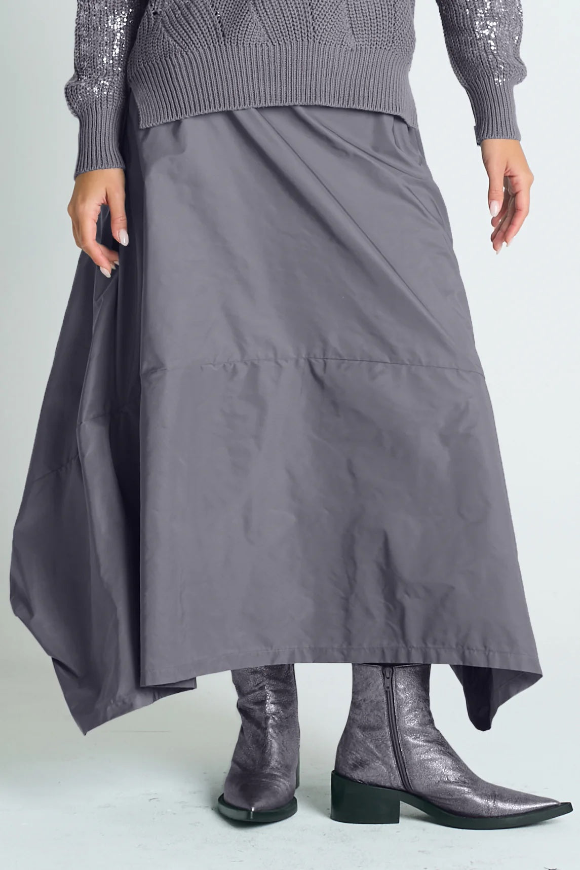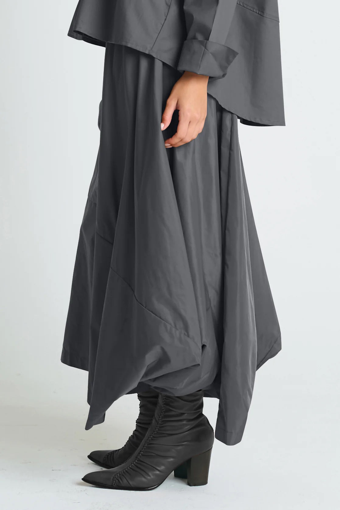 Planet's signature architectural skirt is in sync with their brand’s DNA. Sculptural yet fluid, this skirt brings a bold shape to everyday dressing. Crafted from crisp, lightweight nylon, it features clean pleating, subtle volume, and an easy elastic waistband for all-day comfort. The asymmetric hem and directional silhouette make it a statement piece that still feels effortless—perfect for styling with soft knits, structured tops, or minimal tanks.