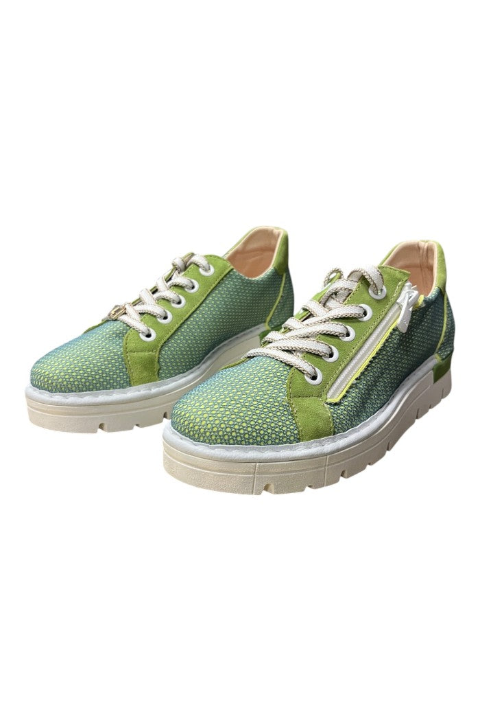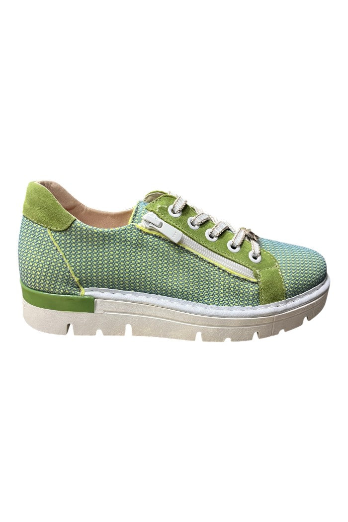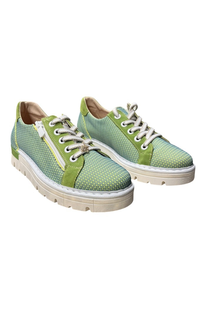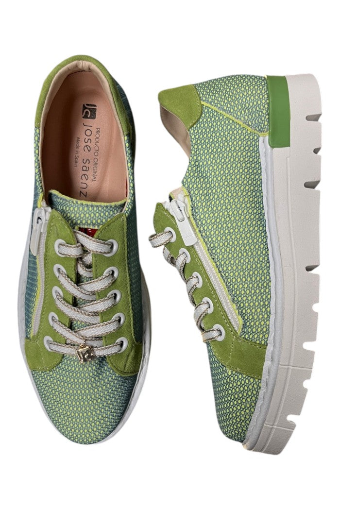 The Argel Pistachio sneaker is a low-top casual shoe with a woven pistachio upper, suede trim, and a chunky rubber platform sole. A side zipper and lace-up front add easy on-off styling and subtle sporty detail. This relaxed, off-duty silhouette works well for weekend errands or city strolls. The shoe is offered by Jose Saenz, reflecting their attention to texture and comfort.