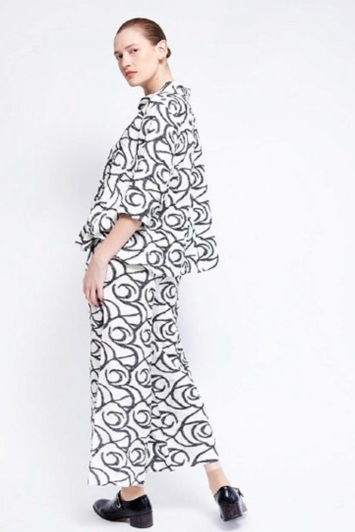 A wide-leg printed trouser cut with a relaxed, ankle-length silhouette, Dolly Pants bring bold graphic style to everyday dressing. The lightweight fabric drapes softly for movement while the high rise flatters the waist. Wear them with the coordinating top for a statement matching set or pair with a simple tee for a casual look. Designed by Gershon Bram, these pants balance artisan patterning with modern, wearable tailoring.