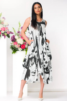 The Elena Wang EW36319 dress is a chic, effortlessly stylish piece designed to elevate your everyday wardrobe. Crafted in a striking black-and-white palette, this dress blends playful silhouette with versatile wearability. The lightweight rayon-polyester fabric moves beautifully with every step, while the relaxed fit and flared “balloon” hem create a flattering, feminine shape that suits a variety of occasions — from weekend brunches to casual gatherings.