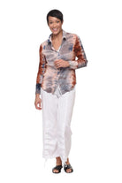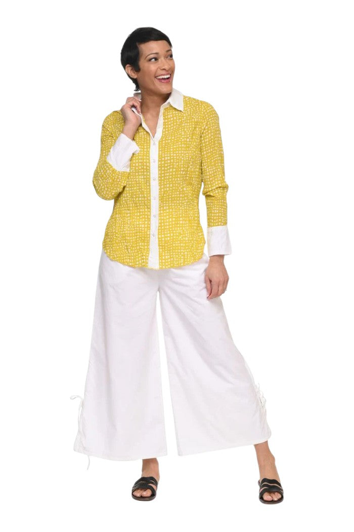 Crinkled button-down blouse, featuring ribbon trim and cuffs. Runs smaller than most Tulip.