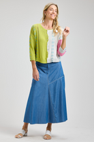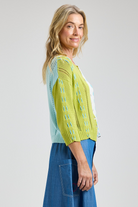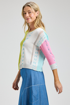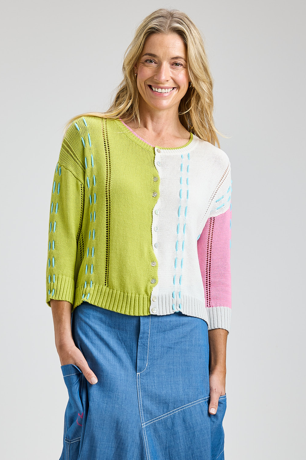 A lightweight, colorblock knit cardigan with button‑front closure and a slightly cropped silhouette. The Threaded Detail Cardigan from Zaket & Plover features lime, white and pink panels with contrast stitched details and a ribbed hem. Three-quarter sleeves and an open, scoop-style neckline make it an easy casual layering piece for relaxed days at home or weekend wear.