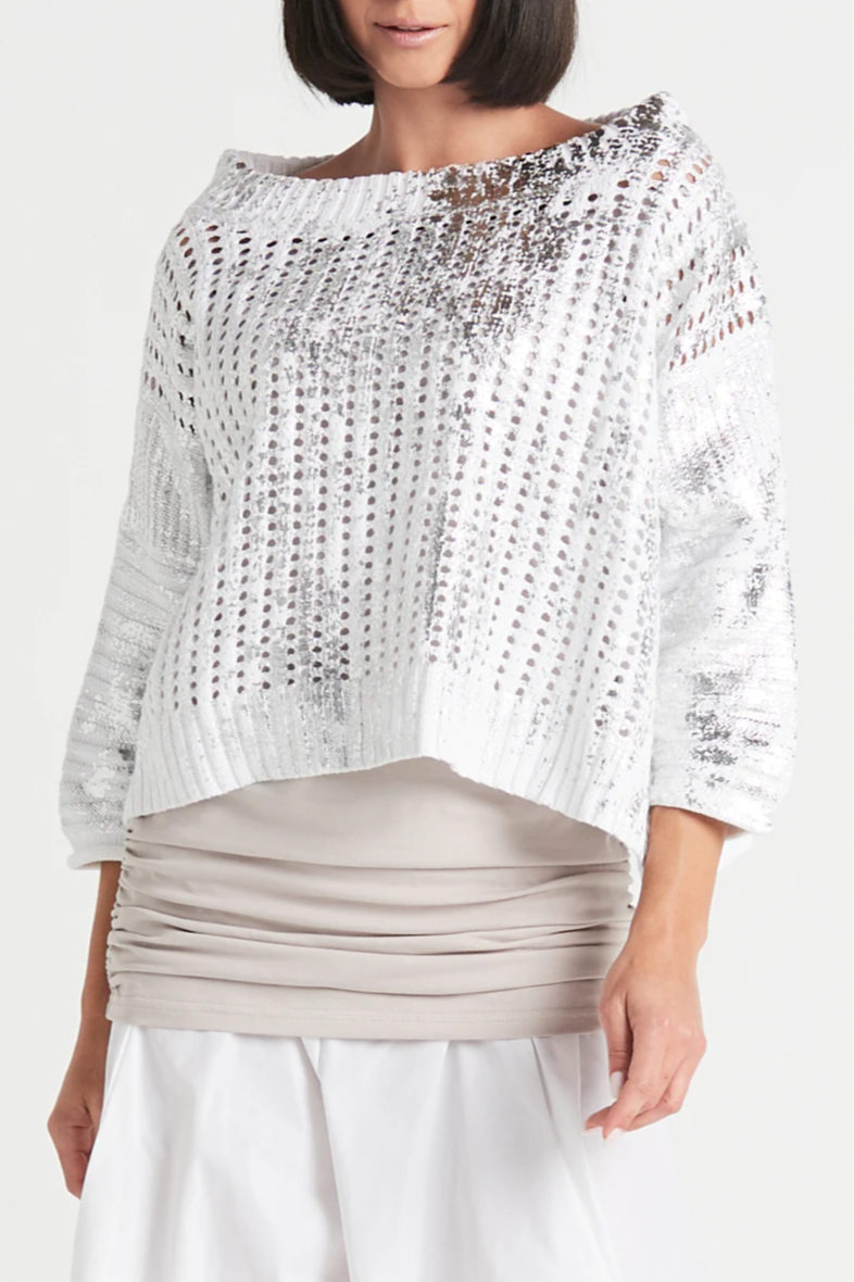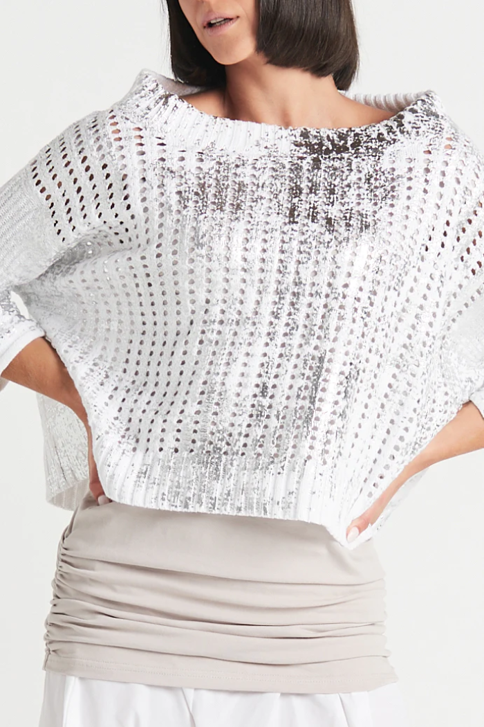 Catch me if you can, dress up and shine! No matter where you are heading, this metallic crochet will get you there in style. It’s been known to hit dinner parties, impromptu meetups, and soirées. Unique open work is mixed with sleeve rib details. Features drop shoulder and bi-level hem. Seasonless color combos make a statement.