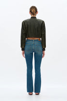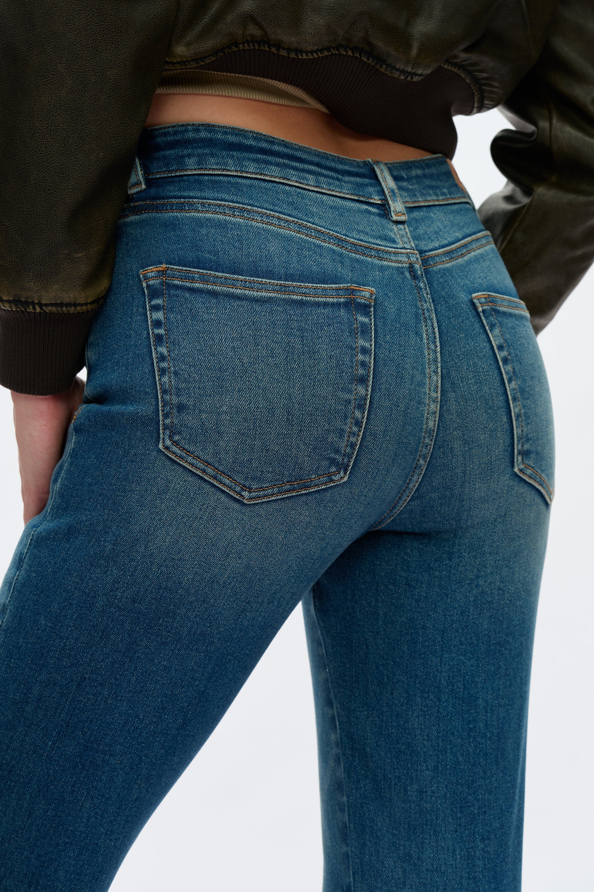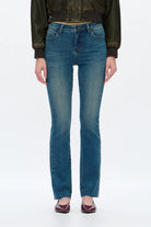 Mid rise slim straight jeans from Bayeas, light blue water washing, with conventional cats and handmade fading processes in the front.