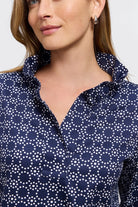 The beloved Tammy is back, reimagined as a polished popover. Made from Foxcroft's signature cotton sateen, this version showcases a modern navy geo print that adds pattern and personality to every outfit. The ruffled collar and V-neck with a snap closure strike the perfect balance between feminine and effortless, while side slits and a relaxed fit make it easy to wear and even easier to love.