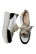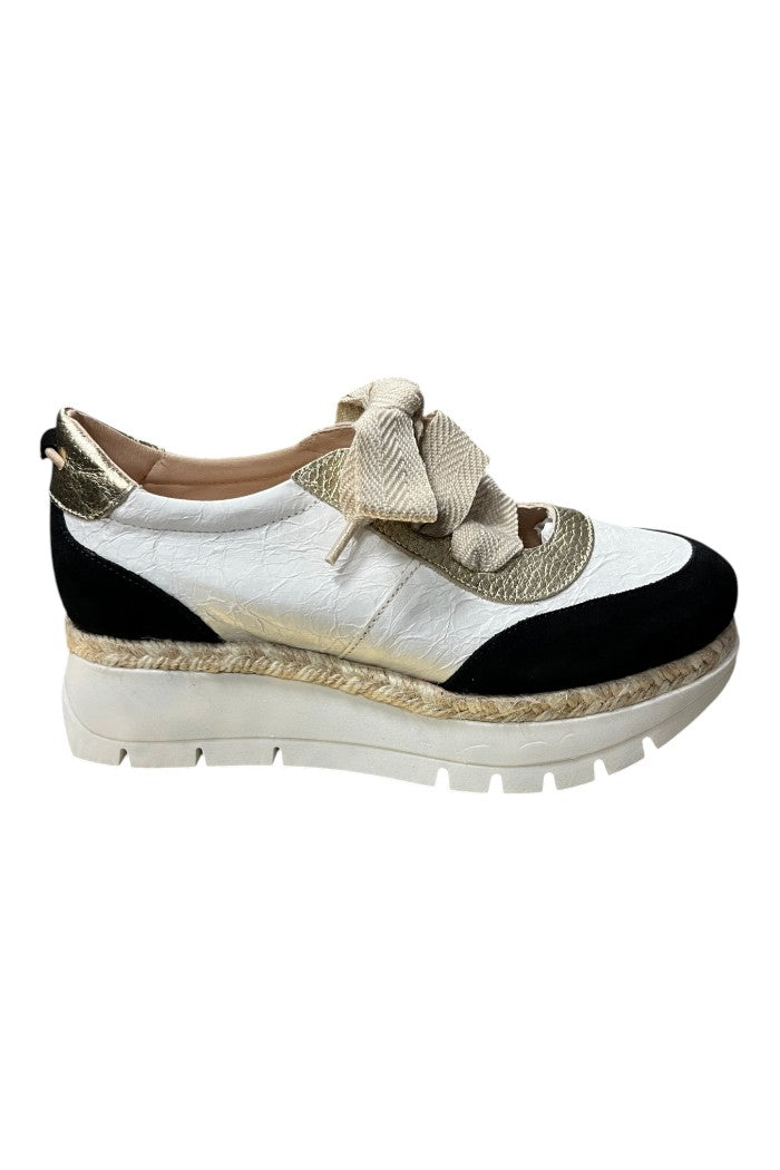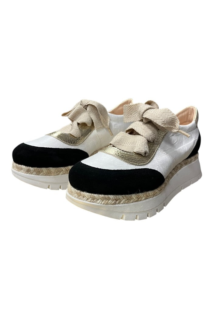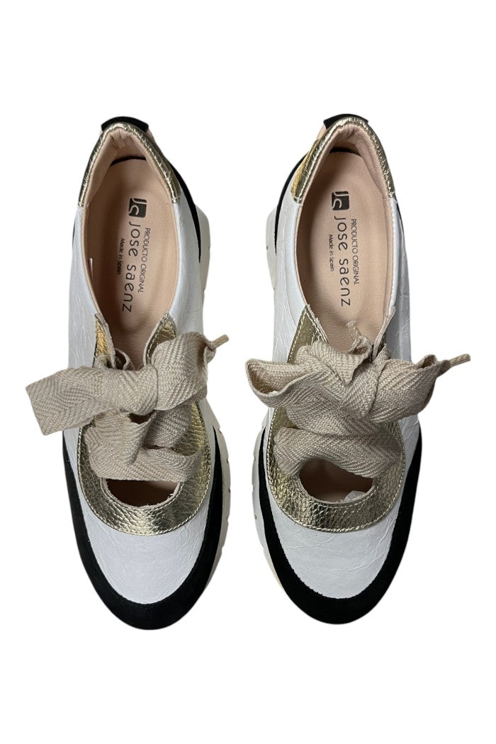 The Velour Negro sneaker is a platform low-top with espadrille-inspired jute trim and a chunky rubber sole. This Jose Saenz design pairs crinkled white leather panels with black suede toe accents and metallic details for a modern, textural look. A wide ribbon lace and cushioned collar give a feminine, off-duty vibe that works on the weekend or out on the town. Wear them with cropped jeans or summer dresses to balance sporty height with casual polish.