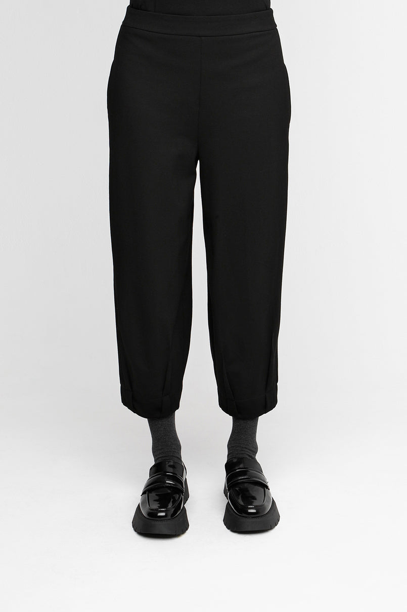 The tapered leg finishes with a pleated hem detail, adding subtle shape and texture, while side seam pockets bring practical versatility. Crafted from a soft, stretch jersey blend, they drape beautifully and retain comfort and structure through wear.