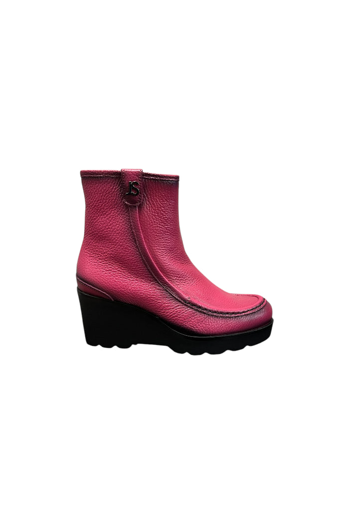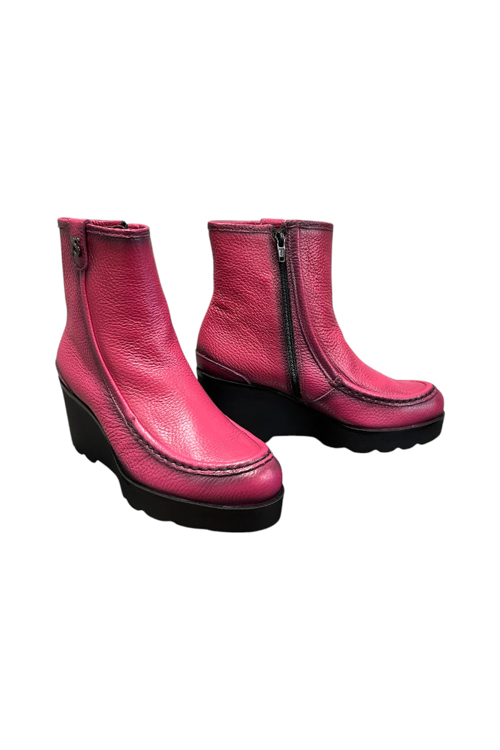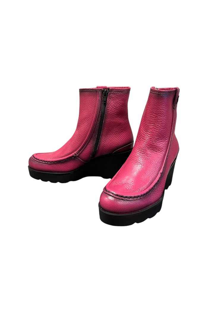 Add a bold pop of color to your wardrobe with these vibrant fuchsia ankle boots. Made from soft, textured leather, they feature a sleek zipper closure for easy wear and a curved platform wedge for all-day comfort. The detailed stitching adds a touch of craftsmanship, while the lugged sole ensures durability and style. These boots effortlessly combine fashion and function, perfect for making a statement!