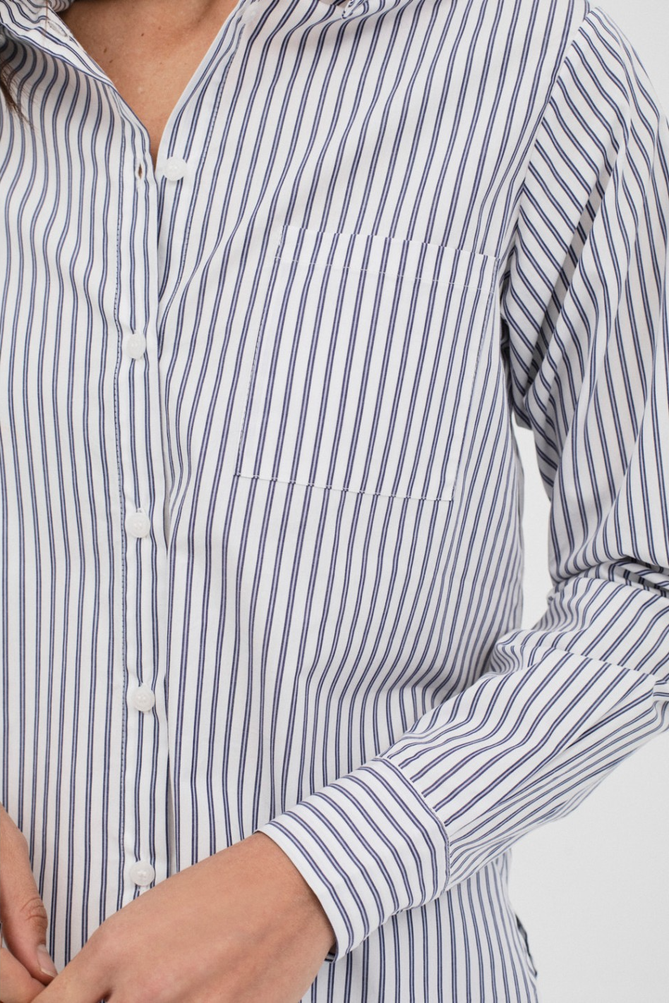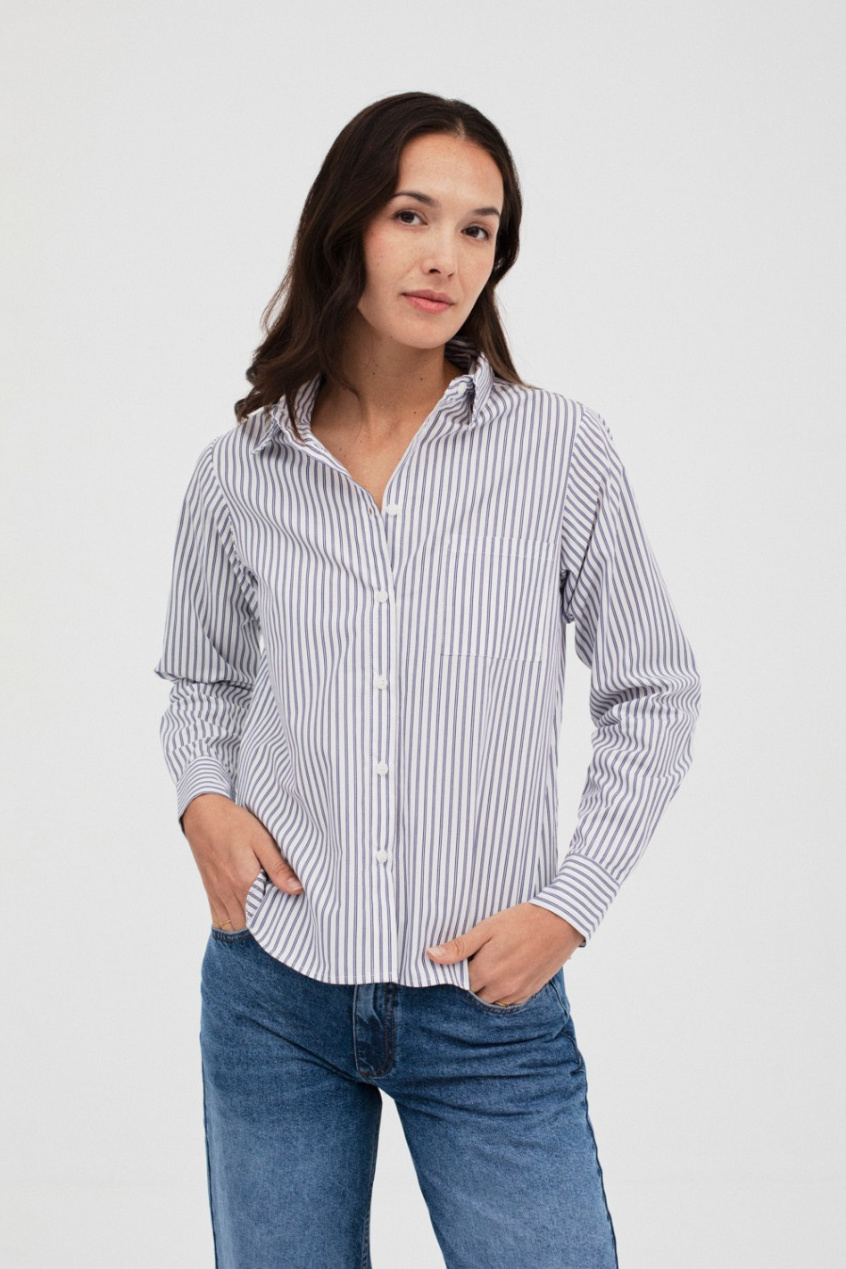 A striped cotton shirt with a shirt collar, yoke and chest pocket. It has side slits and double button cuffs. Perfect for the office.