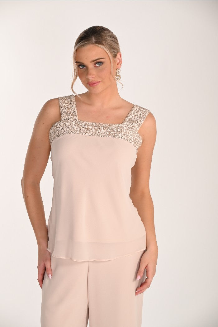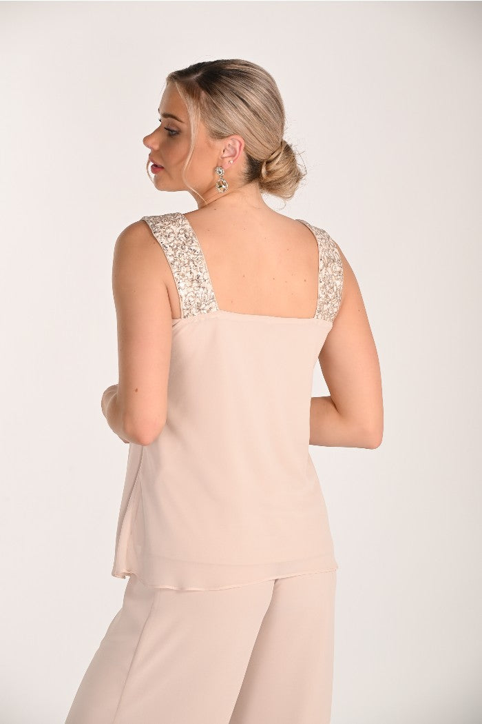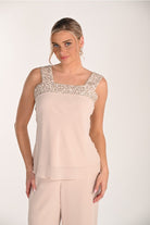 The Frank Lyman Champagne Top 268188 is a beautifully crafted sleeveless knit pullover designed for effortless style and versatility. Featuring a chic square neckline and hip-length cut, this piece offers a flattering regular fit that’s perfect for both casual outings and more polished looks. Subtle jewel embellishments add a refined sparkle to the soft champagne hue, making it a standout addition to your wardrobe. Designed with quality and comfort in mind, this elegant top transitions seamlessly from day to evening wear.