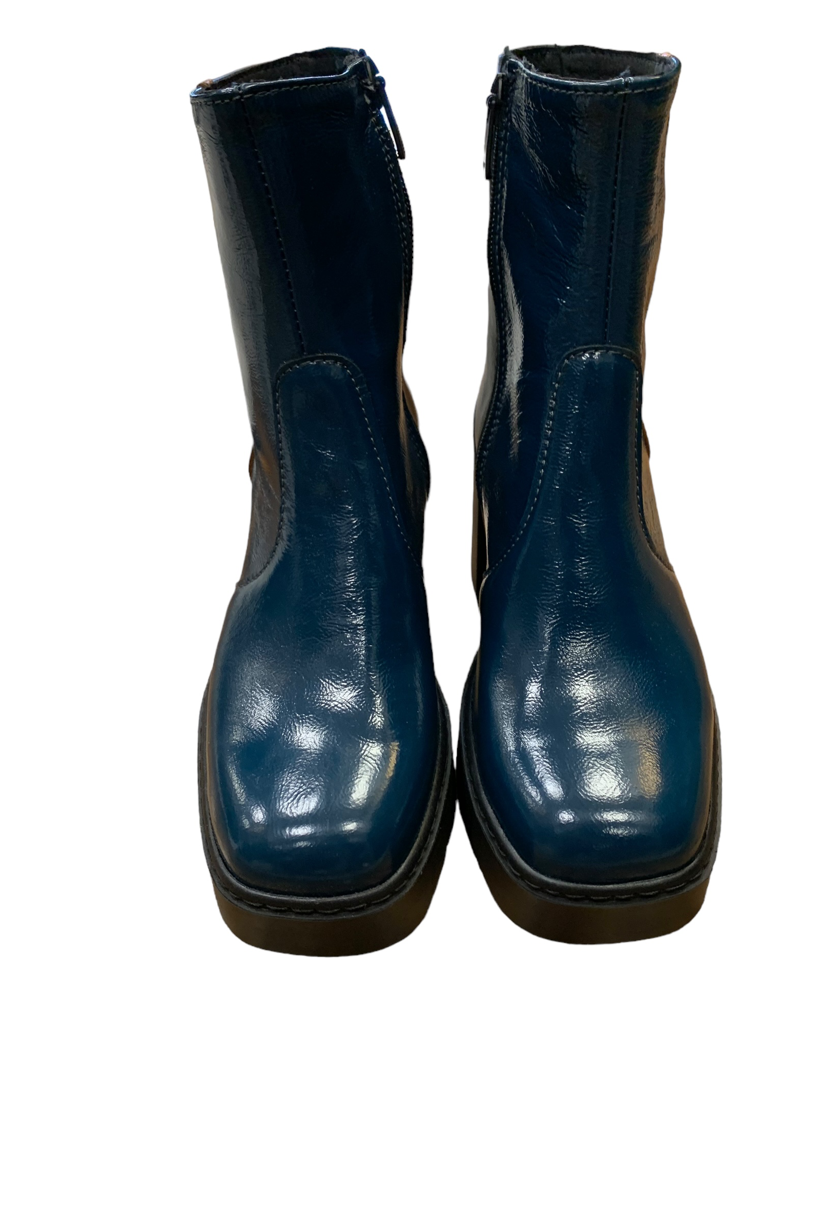 These boots are so much fun. The patent is a beautiful teal color which may not have translated in the photo. The black back and the contrasting strip of tobacco make this boot a show stopper.