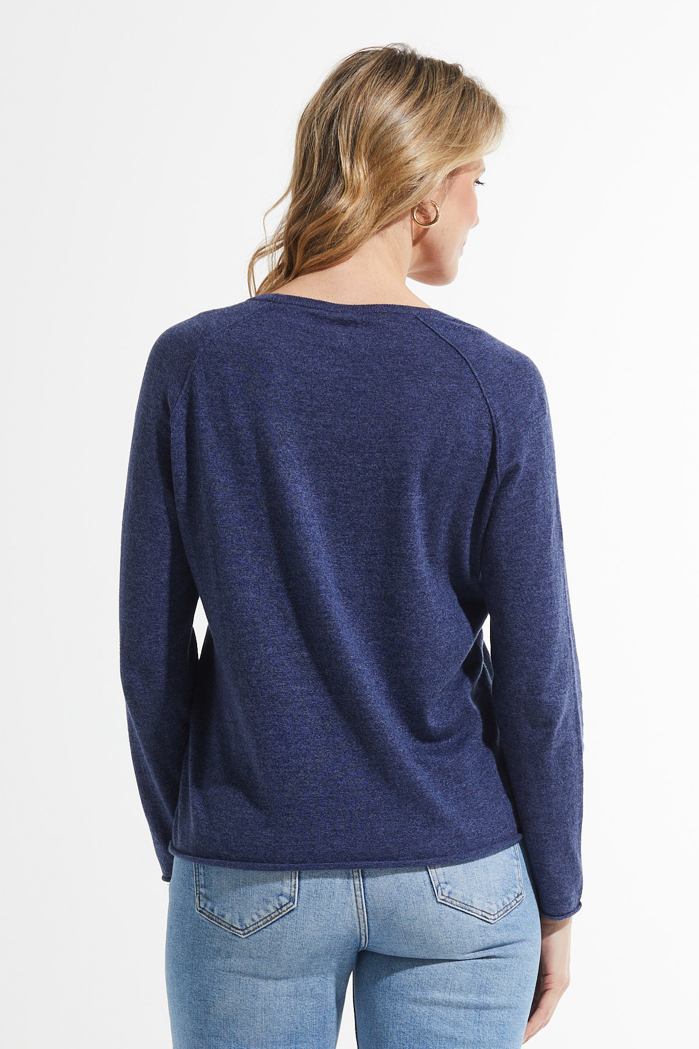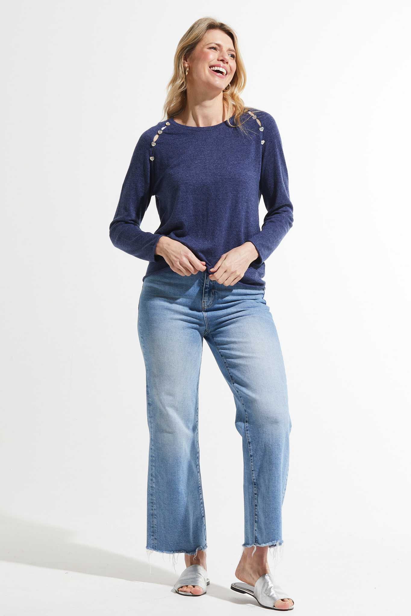 Elevate your everyday style with this effortlessly chic sweater in a rich denim hue. Featuring a classic crew neckline, this sweater is adorned with eye catching button details along the shoulders for a touch of sophistication. Crafted for comfort and versatility, it's perfect for dressing up or down, making it a wardrobe essential for any season.