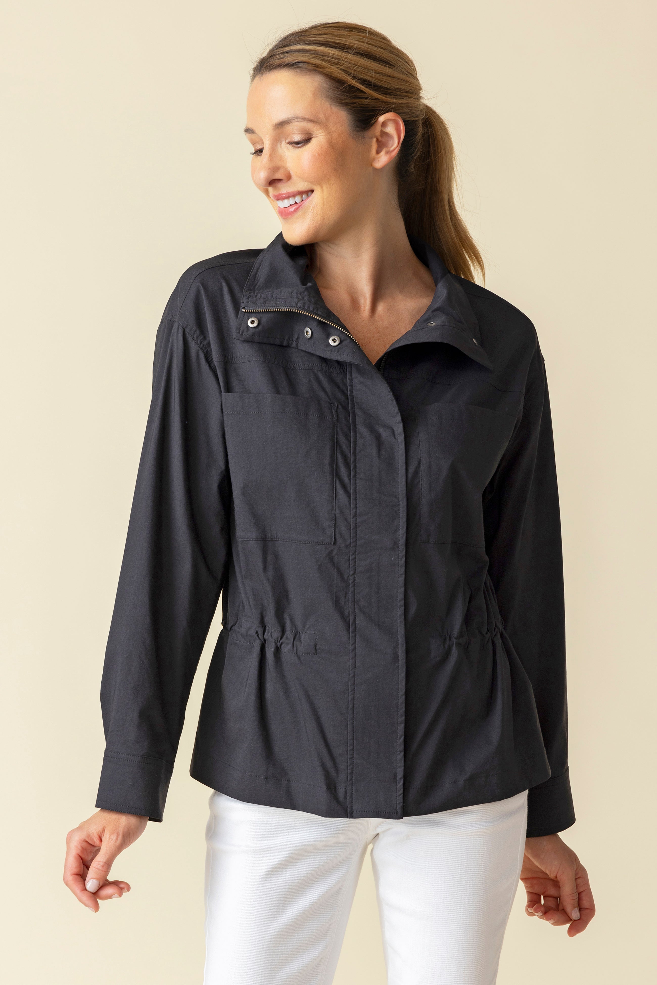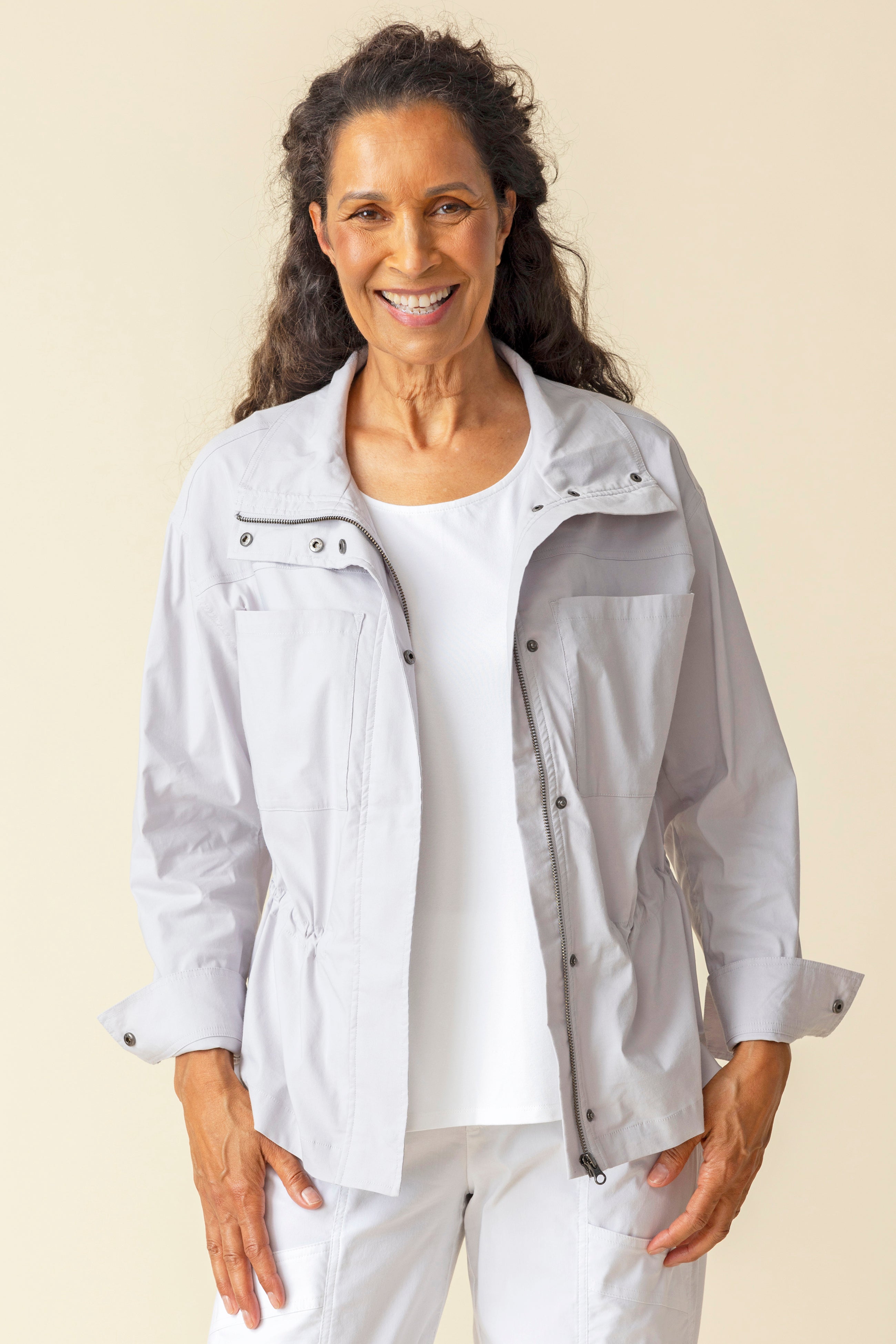 Meet your new go-to layer for spring — crafted from a lightweight blend of cotton, nylon, and spandex for the perfect mix of comfort and style. Crisp and breathable, it's ideal for those in-between days when you need just a touch of warmth. Thoughtful details like the adjustable drawstring waist, zip front with snap closures, and practical patch pockets make it as functional as it is fashionable.