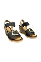 Chic and versatile, these black wedge sandals feature a natural jute-wrapped heel for a classic warm-weather look. A gold metal circle at the toe adds a modern, polished touch. Effortlessly stylish, they’re perfect for everything from casual days to evening dinners.