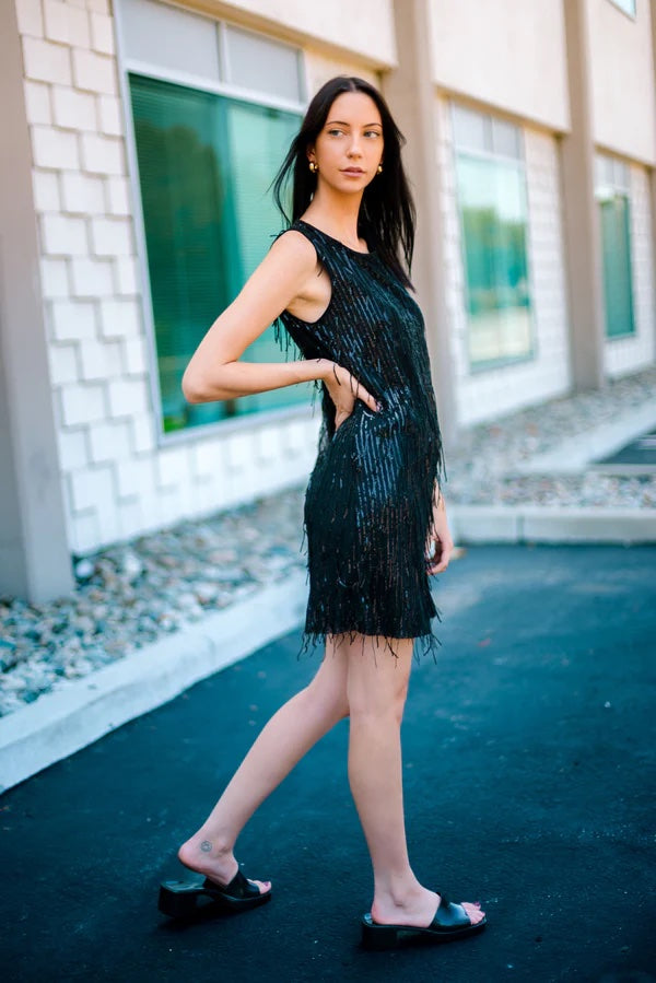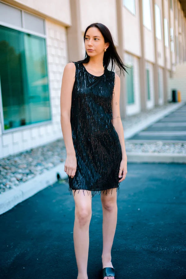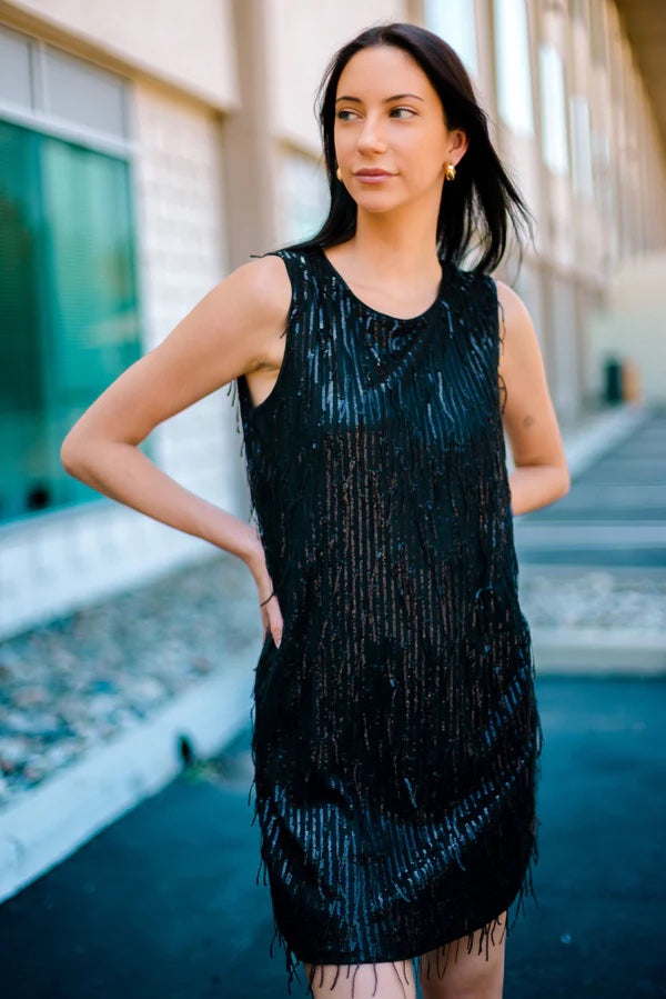 Step into the spotlight and ignite the night with our dazzling sequin fringe dress, where elegance meets exuberance in a symphony of shimmer and sway. Crafted to captivate, every inch of this mesmerizing garment is adorned with cascading sequins, catching the light with every movement and casting a spellbinding aura wherever you go.