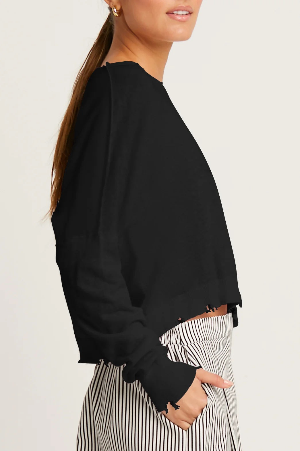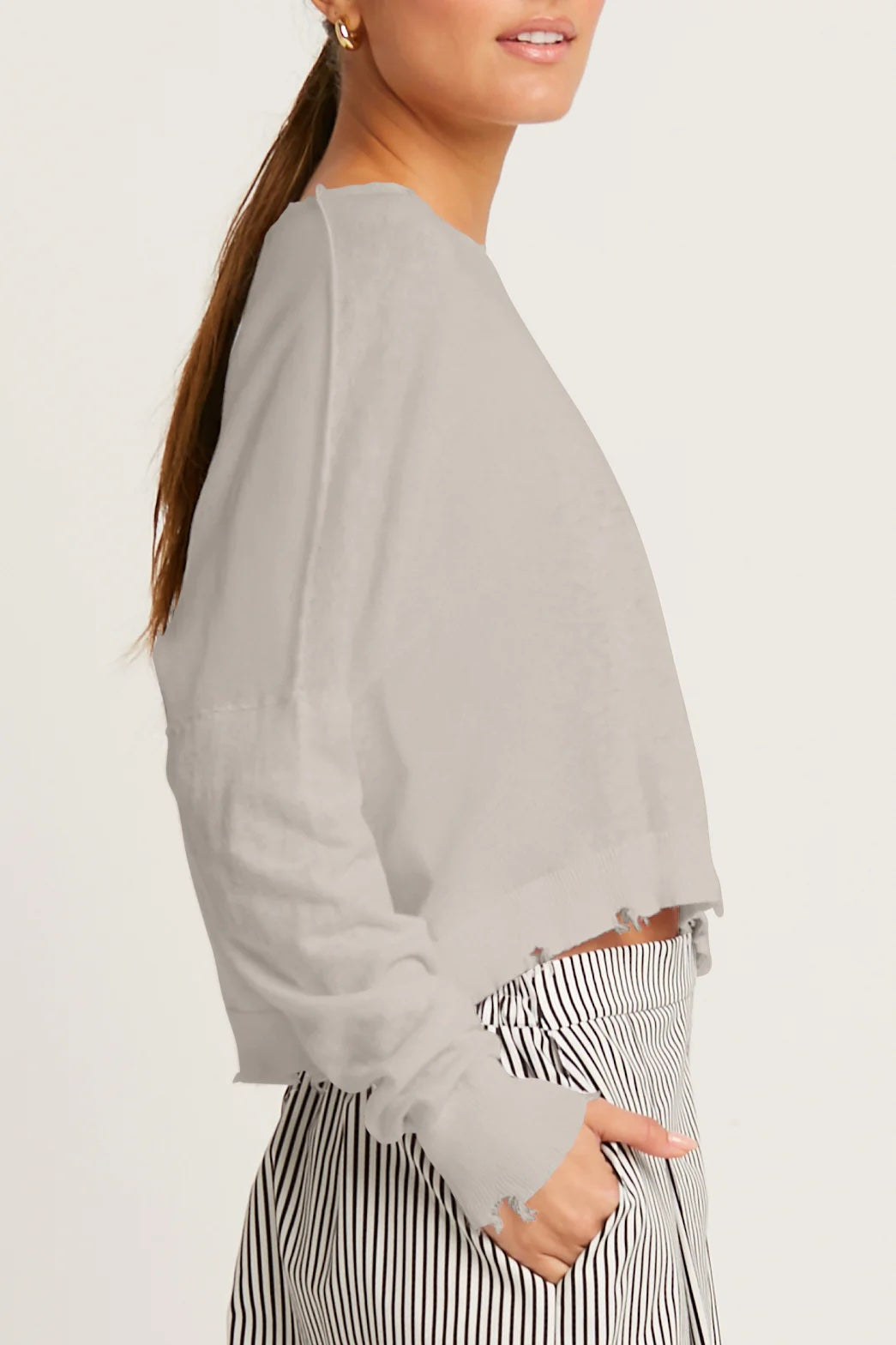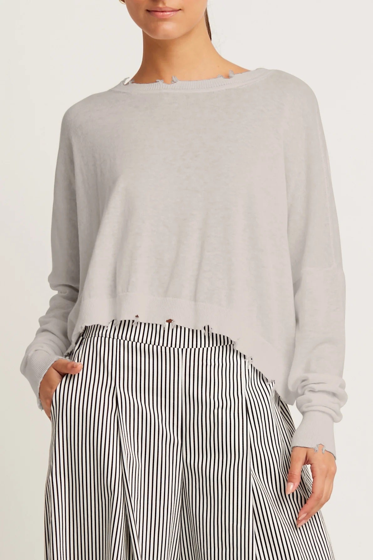 This cropped crewneck sweater from Planet, crafted from a soft blend of Pima cotton and linen, offers lightweight comfort with breathable ease. Subtle shadow detailing and gently distressed edges add a modern touch, while the relaxed silhouette makes it an effortless layer for polished or casual looks alike.
