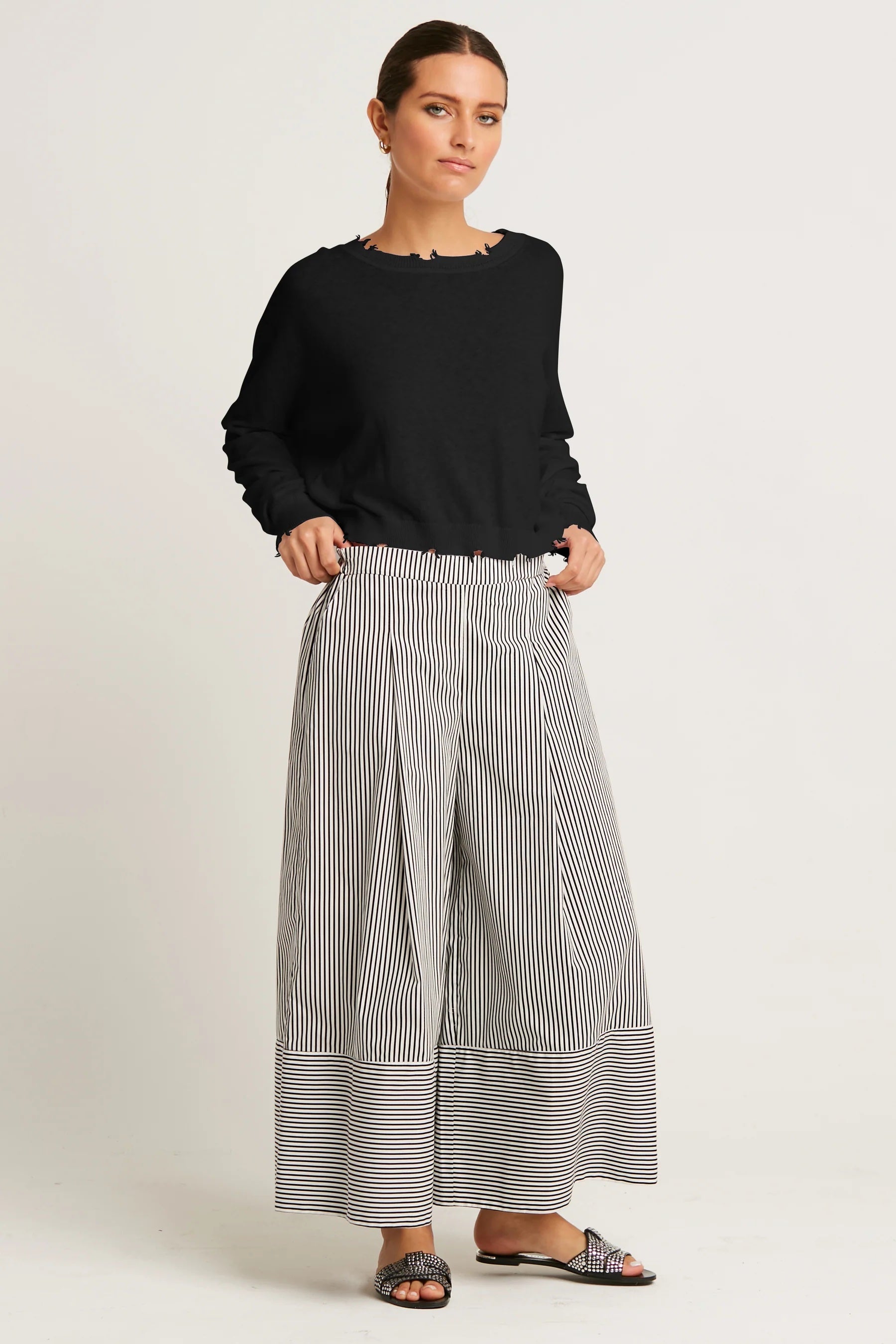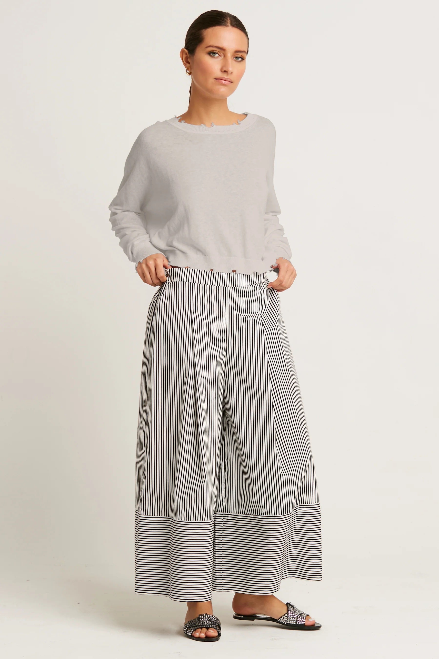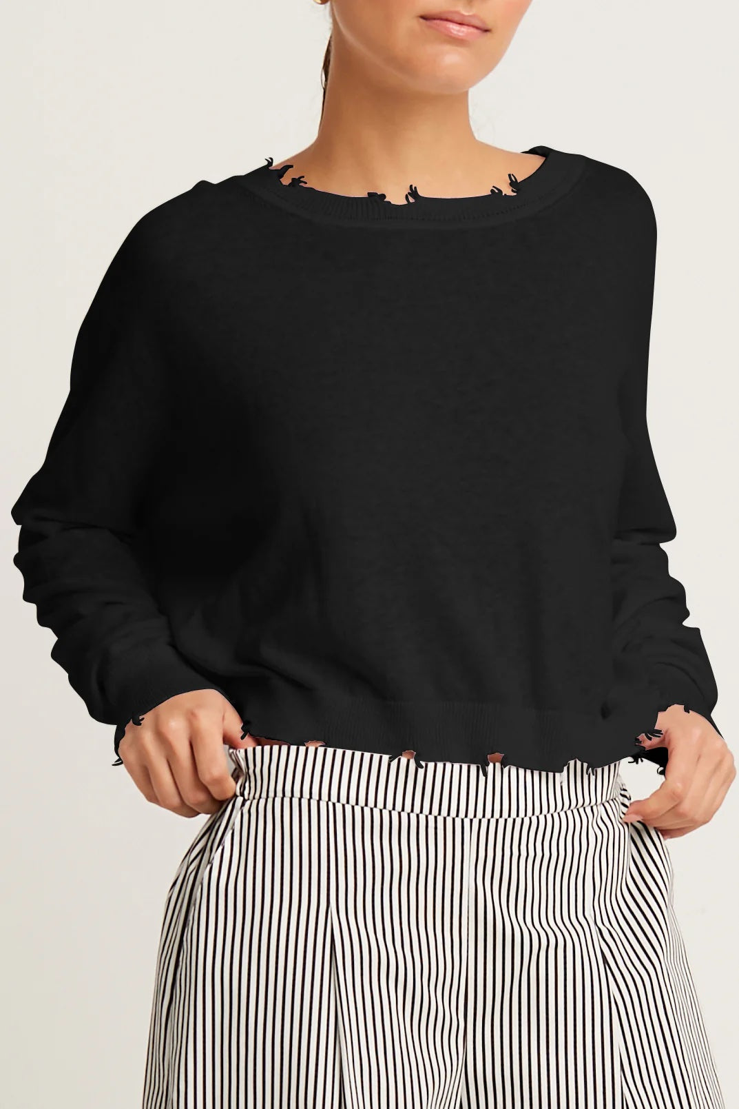This cropped crewneck sweater from Planet, crafted from a soft blend of Pima cotton and linen, offers lightweight comfort with breathable ease. Subtle shadow detailing and gently distressed edges add a modern touch, while the relaxed silhouette makes it an effortless layer for polished or casual looks alike.