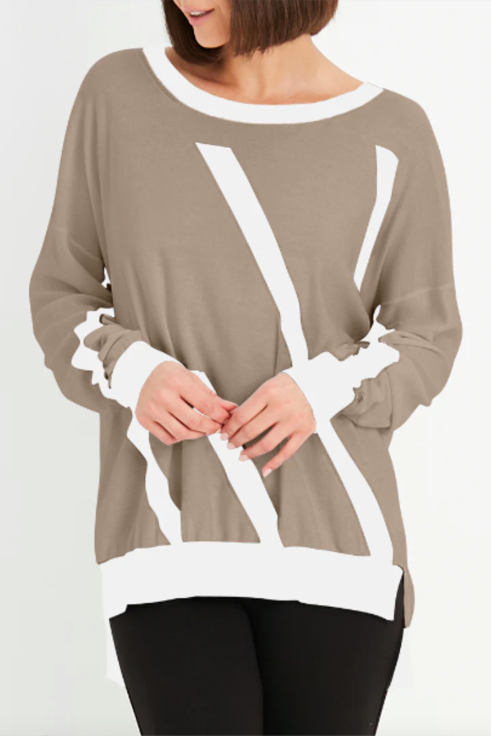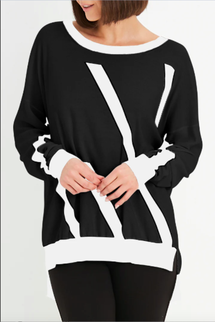 Contemporary design, accentuated by the bold, black directional stripe, makes a statement of sophisticated simplicity. Crafted with the finest blend of Pima cotton and modal, this piece promises softness and a flattering drape, perfect for transitioning through the seasons. With its relaxed fit and striking contrast detail, it's an indispensable addition to the modern wardrobe, blending timeless appeal with a touch of modern edginess.