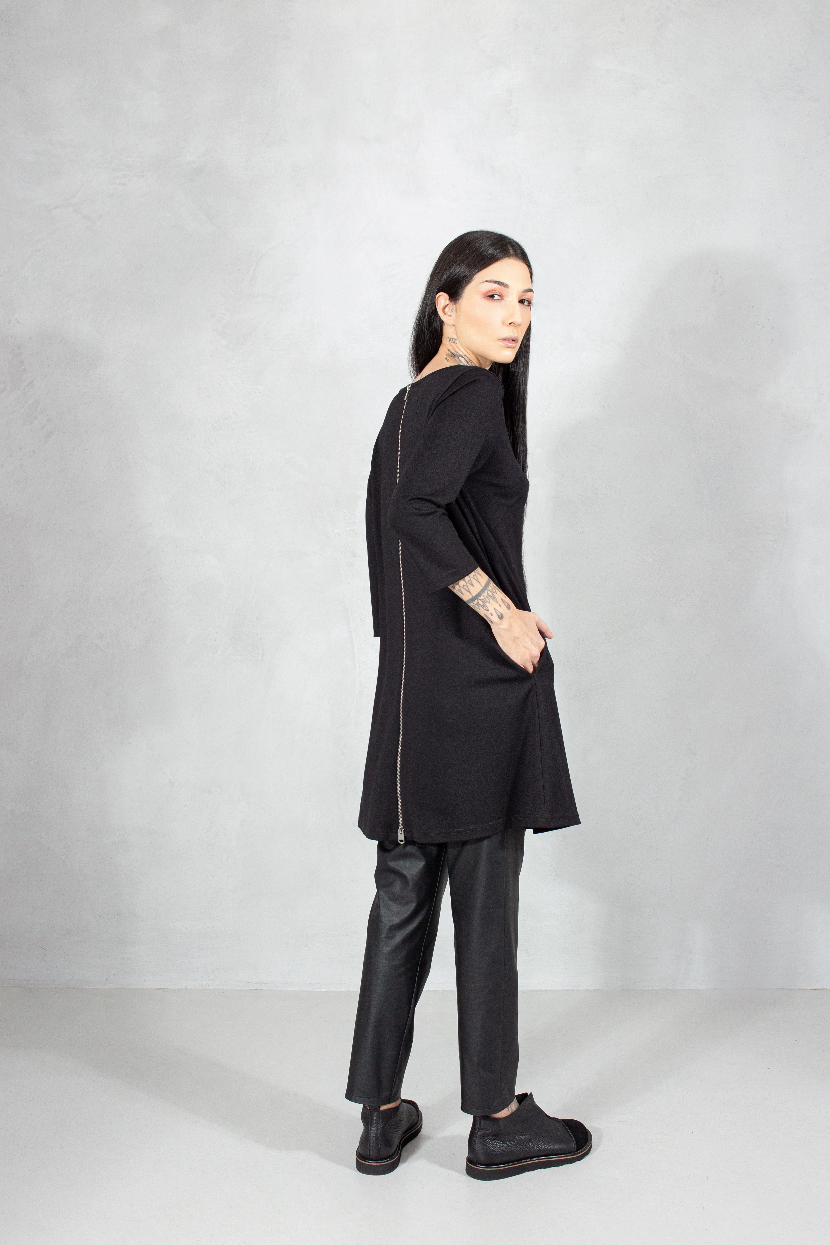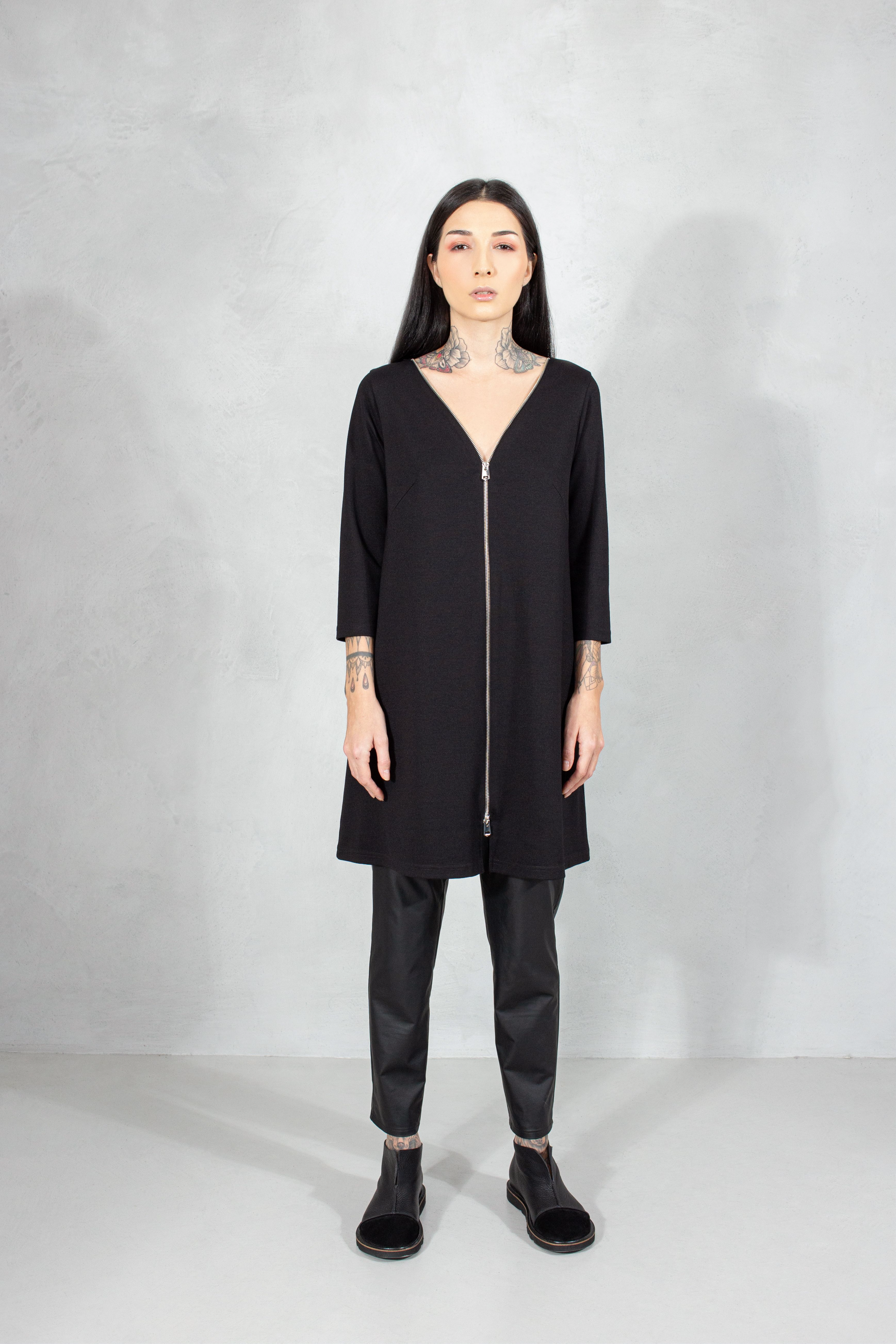 3/4 sleeve dress with v-neck zipper front, pockets and sexy back zipper. Stretch viscose fabric.